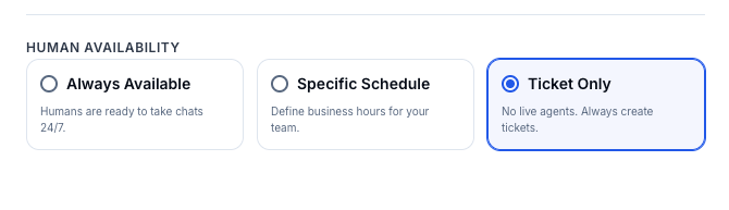 - Ticket Only: A simple toggle to instantly move all human handoffs to the ticketing system.
